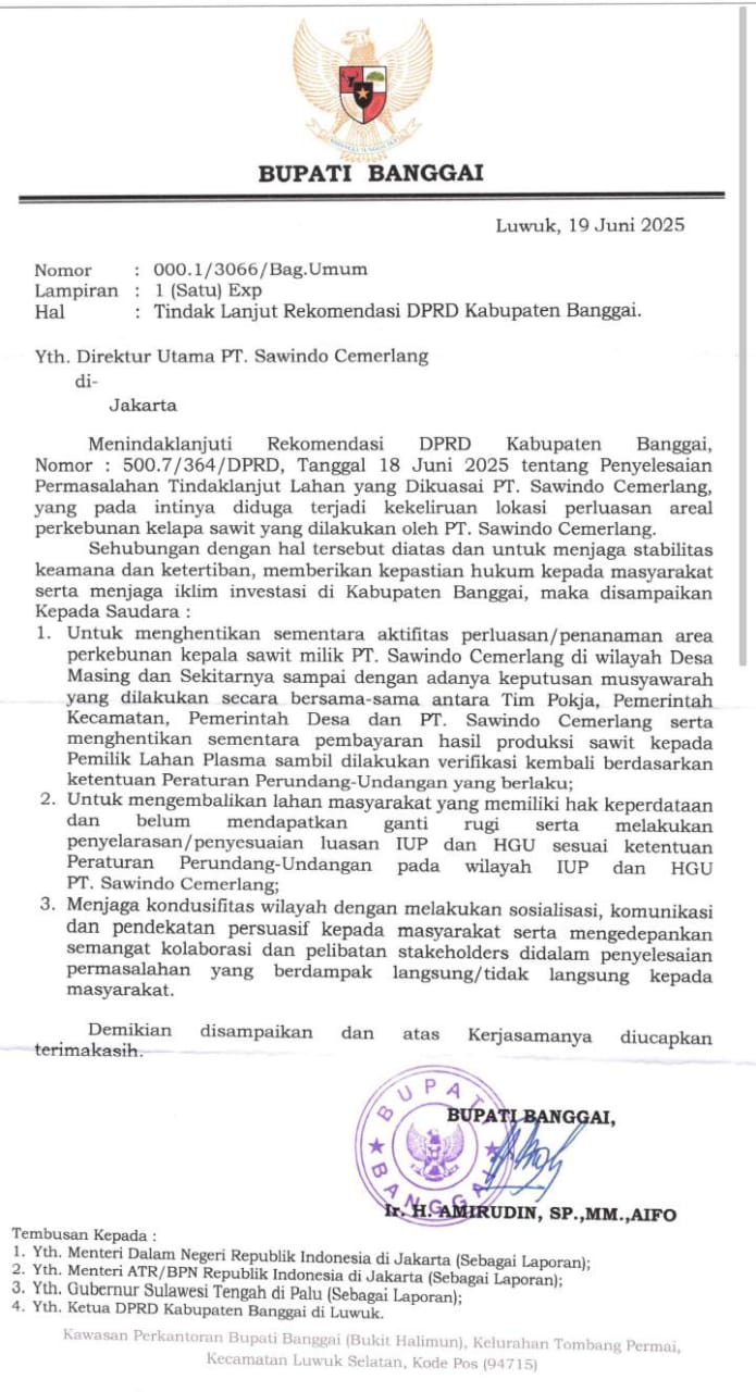 Surat Bupati Banggai Nomor: 000.1/3066/Bag.Umum, tertanggal 19 Juni 2025, secara tegas memerintahkan PT Sawindo Cemerlang menghentikan aktivitas perluasan dan penanaman areal di wilayah Desa Masing dan sekitarnya.
