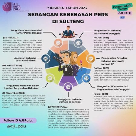 Aliansi Jurnalis Independen (AJI) Kota Palu merilis tujuh insiden serangan kebebasan pers di Sulteng. Rangkuman itu merupakan refleksi akhir tahun. Kasus serangan kebebasan pers itu tercatat mulai Januari hingga Desember 2023. Rangkuman itu dirilis AJI Kota Palu, Selasa (2/1/2024.