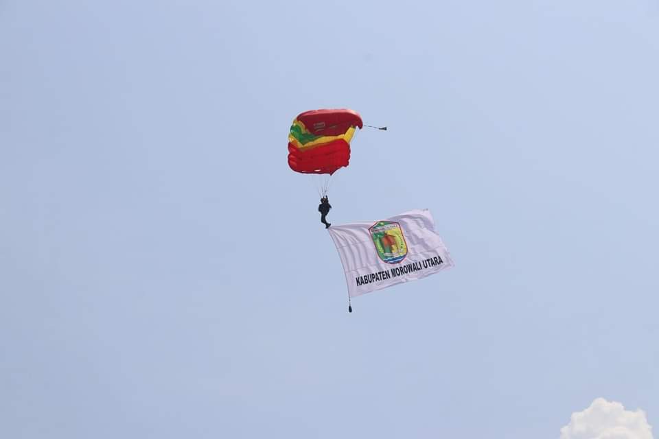 OBORMOTINDOK.CO.ID. MORUT- Perayaan peringatan HUT ke 10 Morowali Utara kali ini terasa istimewa. Peringatan hari jadi Kabupaten Morut, kabupaten ‘anak kandung’ Kabupaten Morowali pada 23 Oktober 2013 silam itu, dimeriahkan aksi terjun payung personel TNI.
