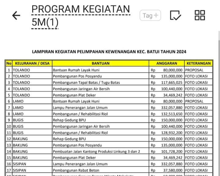 Menurut Lampiran Kegiatan Pelimpahan Kewenangan Kecamatan Batui Tahun 2024, dana sebesar Rp3.892,038,200 telah dialokasikan untuk berbagai kegiatan pembangunan infrastruktur dan program bedah rumah di beberapa desa dan kelurahan di Kecamatan Batui.