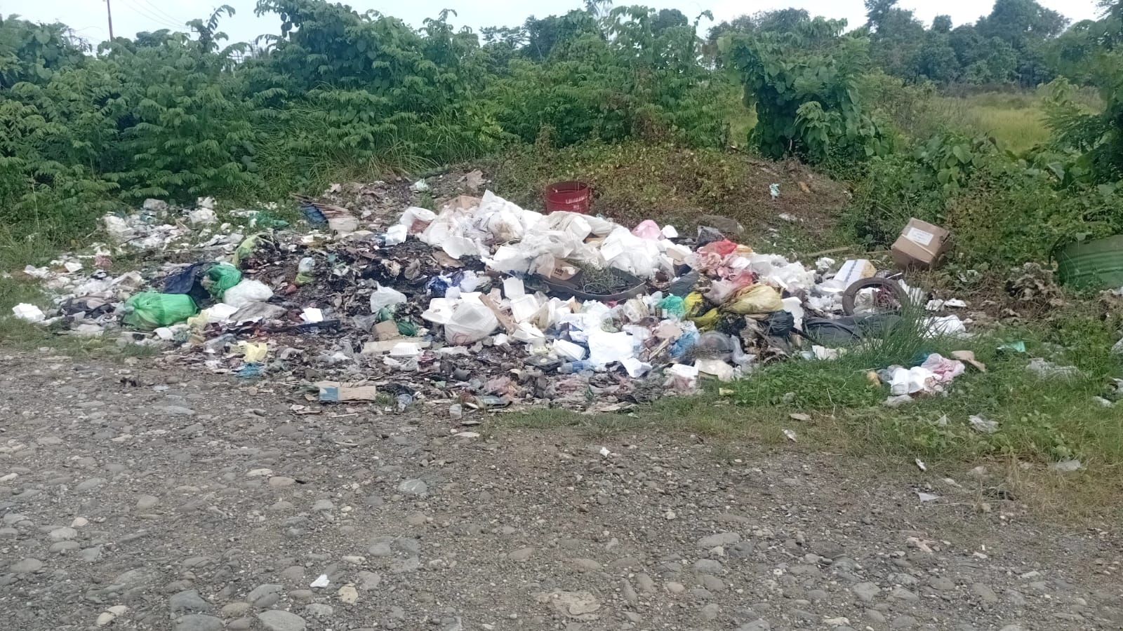 Menurutnya, lokasi penumpukan sampah berada tepat di pinggir jalan yang biasa dilalui warga menuju kebun. Kondisi itu membuat masyarakat merasa terganggu, terutama mereka yang setiap hari melintas di jalur tersebut.