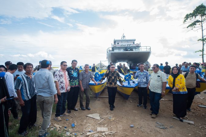 OBORMOTINDOK.CO.ID, LUWUK- Bupati Banggai, Amirudin menyerahkan 38 unit perahu fiber kepada 11 kelompok nelayan yang tersebar di 7 kecamatan, Kamis (28/12/2023), di area galangan kapal Desa Kayutanyo, Luwuk Timur.