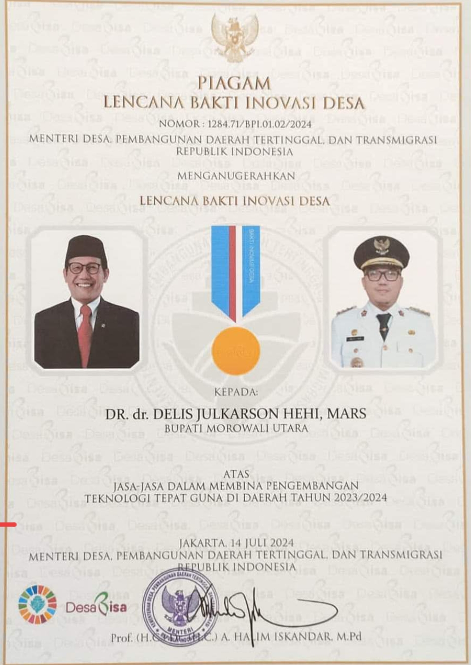 Penghargaan ini diberikan atas kontribusi Bupati Delis dalam pengembangan teknologi tepat guna di Morowali Utara selama tahun 2023/2024.