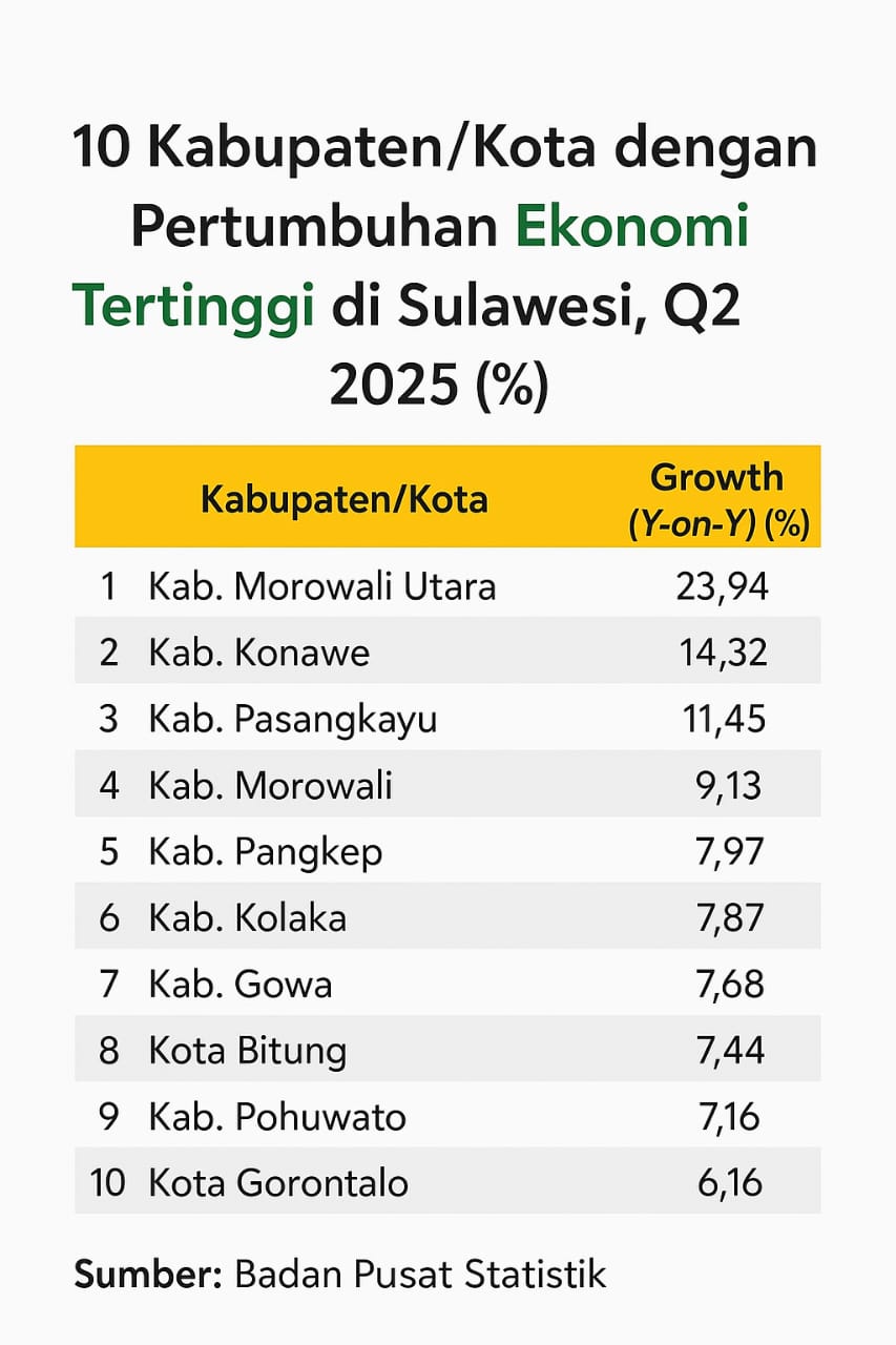 Capaian pertumbuhan ekonomi Morowali Utara mencapai 23,94 persen (year-on-year), menempatkannya jauh di atas daerah lain seperti Kabupaten Konawe (14,32%), Kabupaten Pasangkayu (11,45%), dan Kabupaten Morowali (9,13%). Sementara posisi kelima hingga kesepuluh ditempati oleh Kabupaten Pangkep, Kolaka, Gowa, Bitung, Pohuwato, dan Kota Gorontalo.