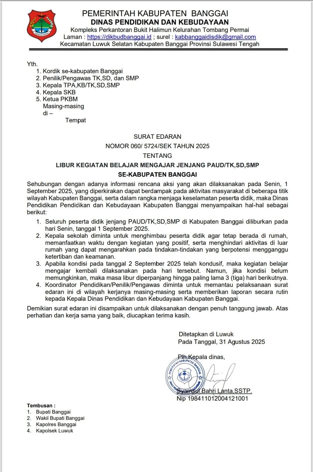 Surat edaran dengan nomor 060/5724/SEK Tahun 2025 tersebut ditandatangani oleh Pelaksana Harian (Plh) Kepala Disdikbud Banggai, Syamsul Bahri Lanta, SSTP, pada 31 Agustus 2025.