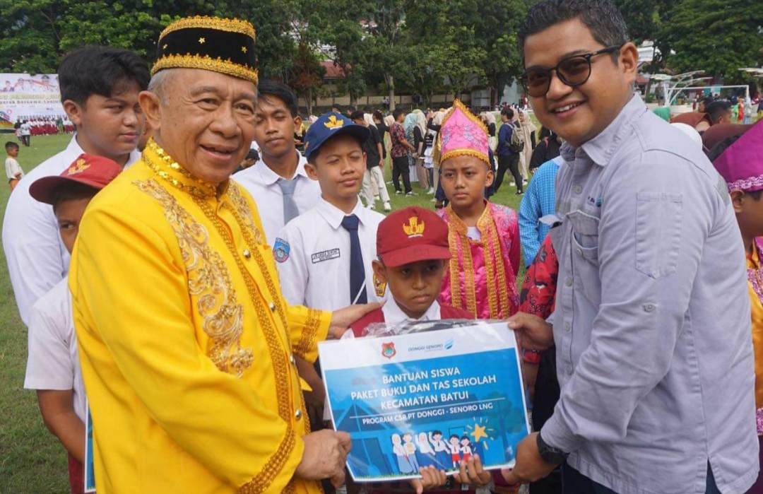 Bantuan diserahkan secara simbolis kepada perwakilan pelajar oleh CSR Manager DSLNG Pradipta Sidi bersama Pemerintah Kabupaten Banggai, dalam hal ini Wakil Bupati Furqanudin Masulili, setelah Upacara Peringatan Hari Pendidikan Nasional di Lapangan Alun-alun Mutiara, Luwuk, Banggai, Sulawesi Tengah, pada Kamis (2/05/2024). Diharapkan, bantuan buku dan tas sekolah yang diberikan secara bertahap ini dapat menambah semangat para pelajar dalam menimba ilmu di sekolah.