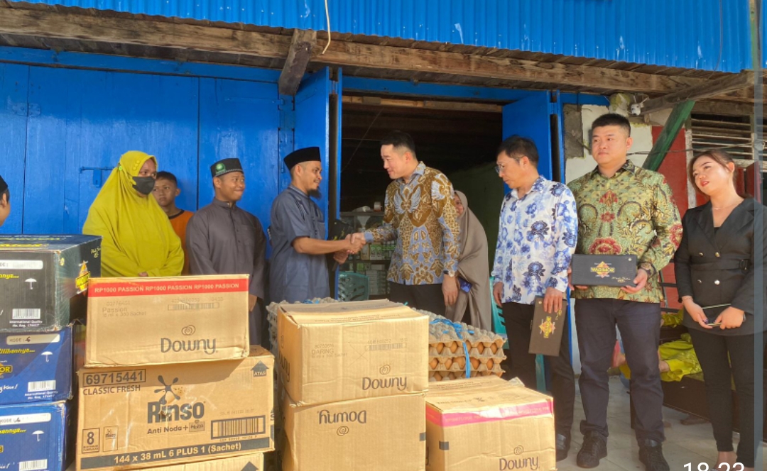 Bantuan bulanan berupa sembako dan perlengkapan sholat disalurkan langsung oleh Pimpinan PT GNI, Zhou Yuan.