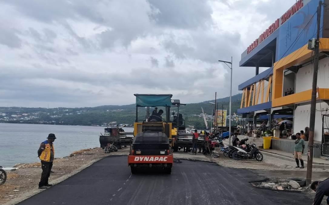 OBORMOTINDOK.CO.ID. LUWUK—Dinas Pekerjaan Umum dan Penataan Ruang (PUPR) Kabupaten Banggai akhirnya menuntaskan peningkatan ruas jalan di kawasan Pasar Simpong, Luwuk. Perbaikan dilakukan mulai dari pertigaan pasar hingga jembatan pasar Simpong.