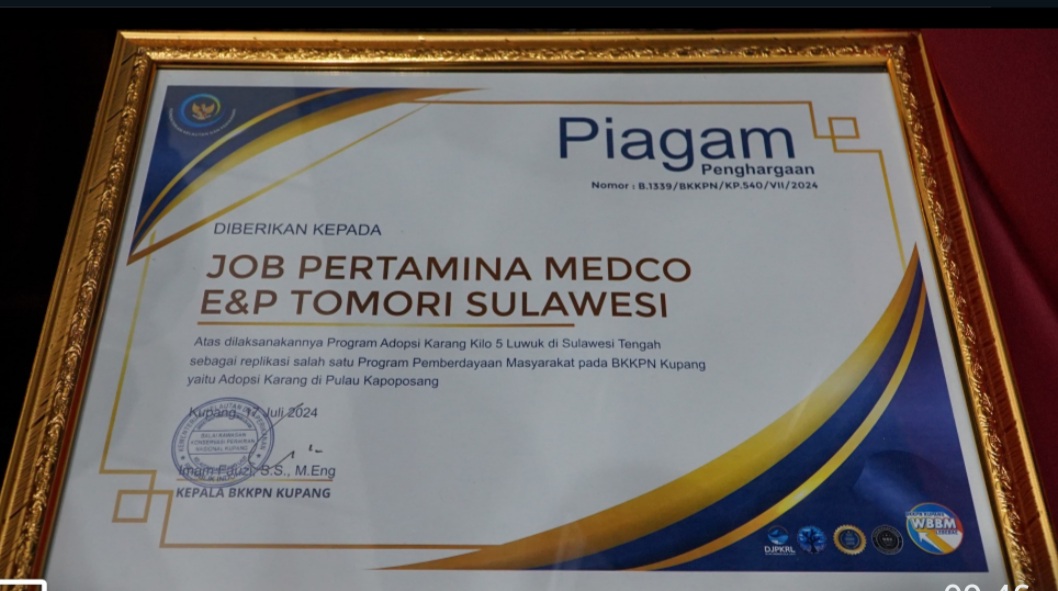 Ia mengapresiasi sinergi antara JOB Tomori, BKKPN, BPSPL, Unismuh Luwuk, dan masyarakat dalam melaksanakan program Adopsi Karang Kilolima Luwuk.