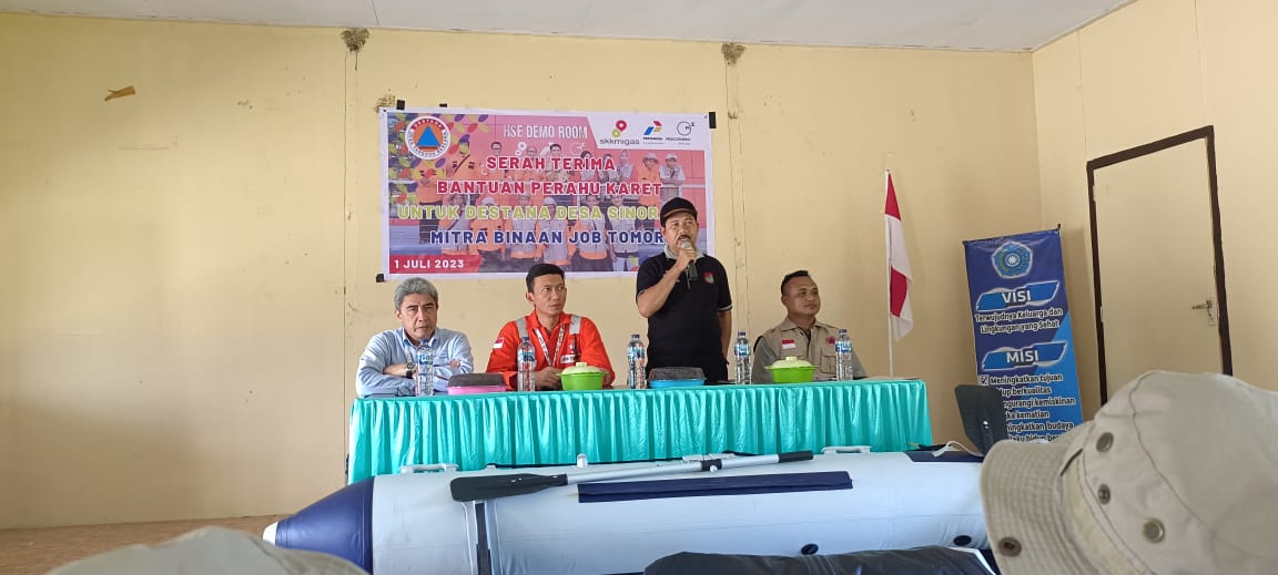 OBORMOTINDOK.CO.ID. Luwuk- Untuk mendukung Desa Tangguh Bencana (Destana) Desa Sinorang, Kecamatan Batui Selatan, yang telah aktif dalam mitigasi dan penanganan bencana sejak tahun 2020, JOB Pertamina Medco E&P Tomori Sulawesi (JOB Tomori) kembali memberikan bantuan dua unit perahu karet.