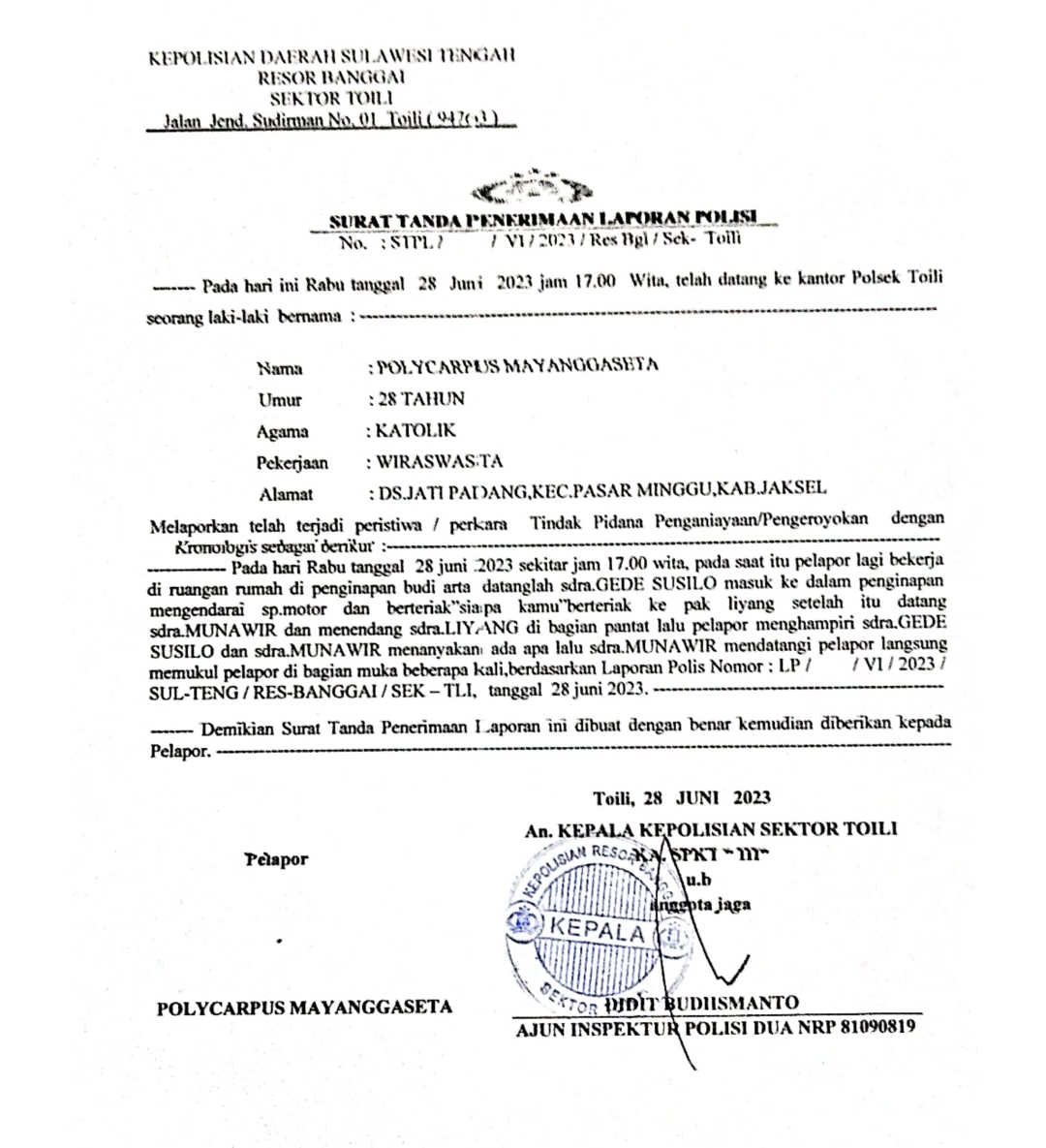 Surat tanda penerimaan laporan polisi yang diterima Polycarpus Mayanggaseta sebagai pelapor itu ditandatangani oleh anggota jaga AIPDA Didit Budiismanto atas nama Kapolsek Toili, KA. SPKT.**