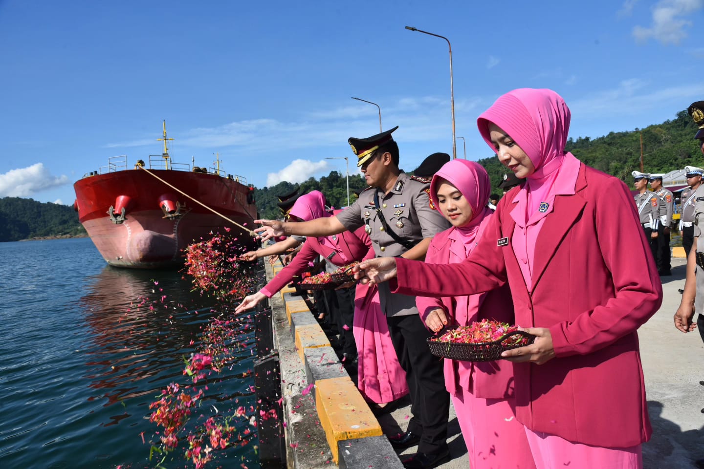 Upacara tabur bunga di laut yang digelar di Kawasan Pelabuhan Kolonodale, Kecamatan Petasian, Selasa (27/6/2023) dipimpin oleh Kapolres Morowali Utara AKBP Imam Wijayanto, S.I.K., M.H.