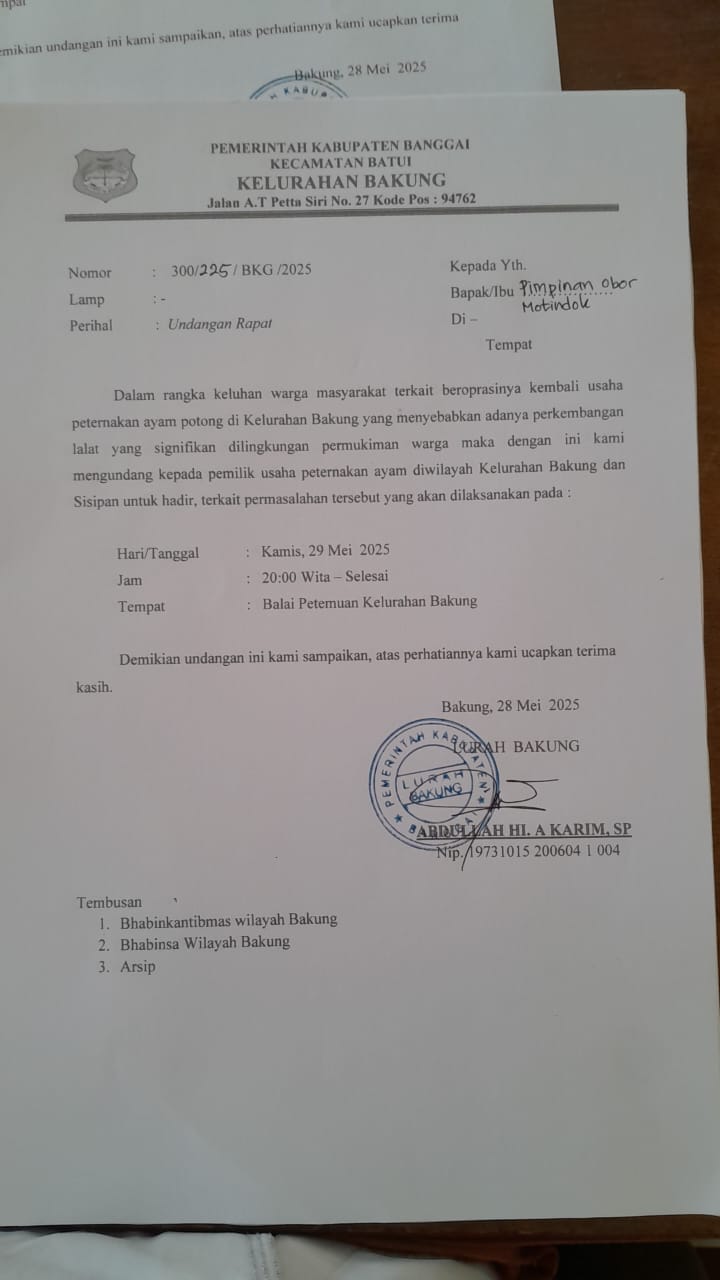 Dalam rangka menindaklanjuti keluhan masyarakat terkait beroperasinya kembali usaha peternakan ayam potong di Kelurahan Bakung yang menyebabkan peningkatan populasi lalat di lingkungan pemukiman, maka dengan ini kami mengundang seluruh pemilik usaha peternakan ayam potong di wilayah Kelurahan Bakung dan Sisipan untuk menghadiri rapat yang akan dilaksanakan pada: