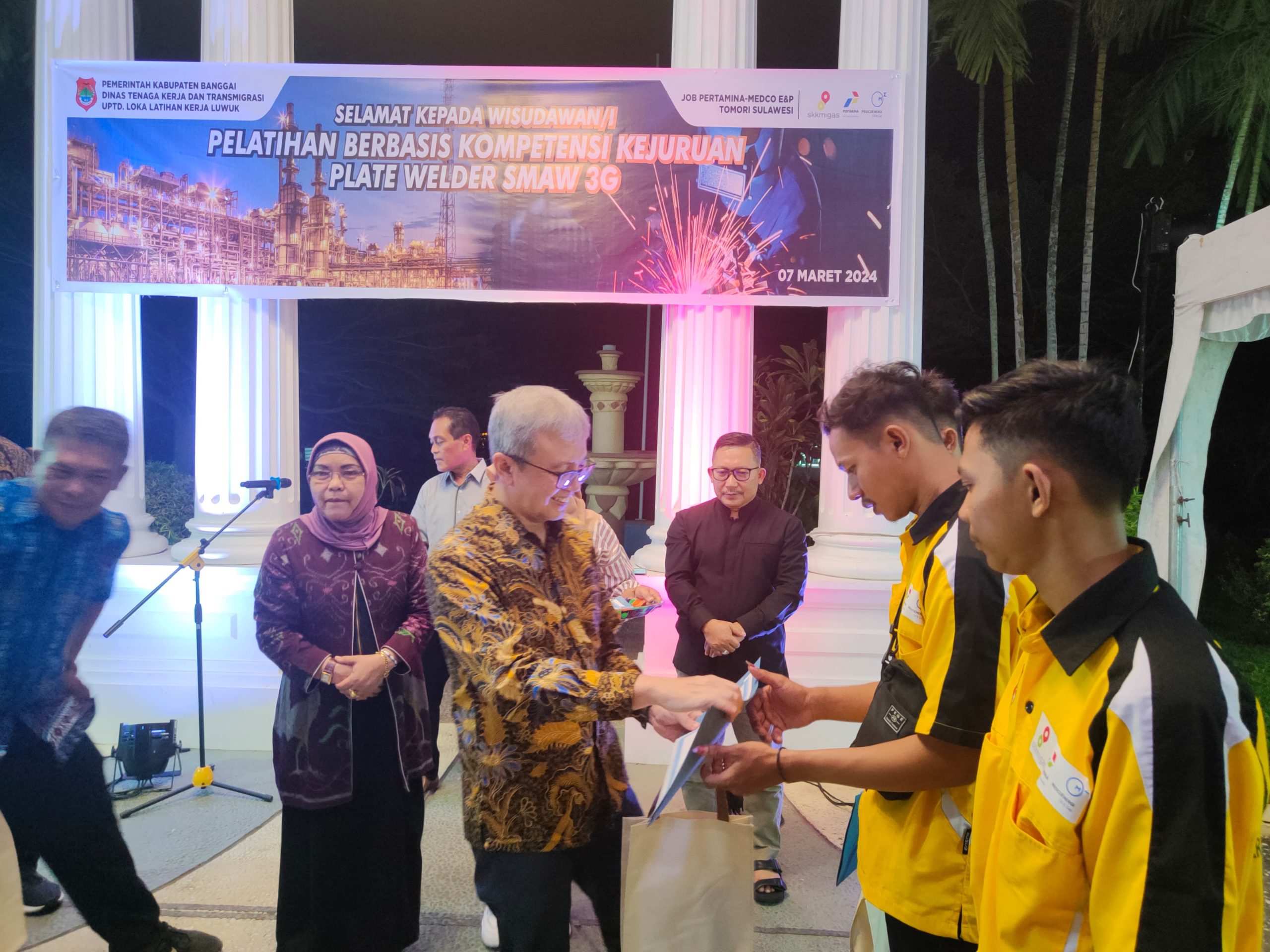 OBORMOTINDOK.CO.ID, LUWUK- Dinas Tenaga Kerja dan Transmigrasi (Disnakertran) Banggai bekerja sama dengan Joint Operating Body Pertamina Medco E&P Tomori Sulawesi (JOB Tomori) melaksanakan program pelatihan Plate Welder SMAW 3G. Agenda telah berakhir dan ditutup secara resmi Bupati Banggai, Amirudin berlangsung di Rumah Jabatan Bupati Banggai Kawasan Bukit Halimun, Kamis (7/3/2024) malam.