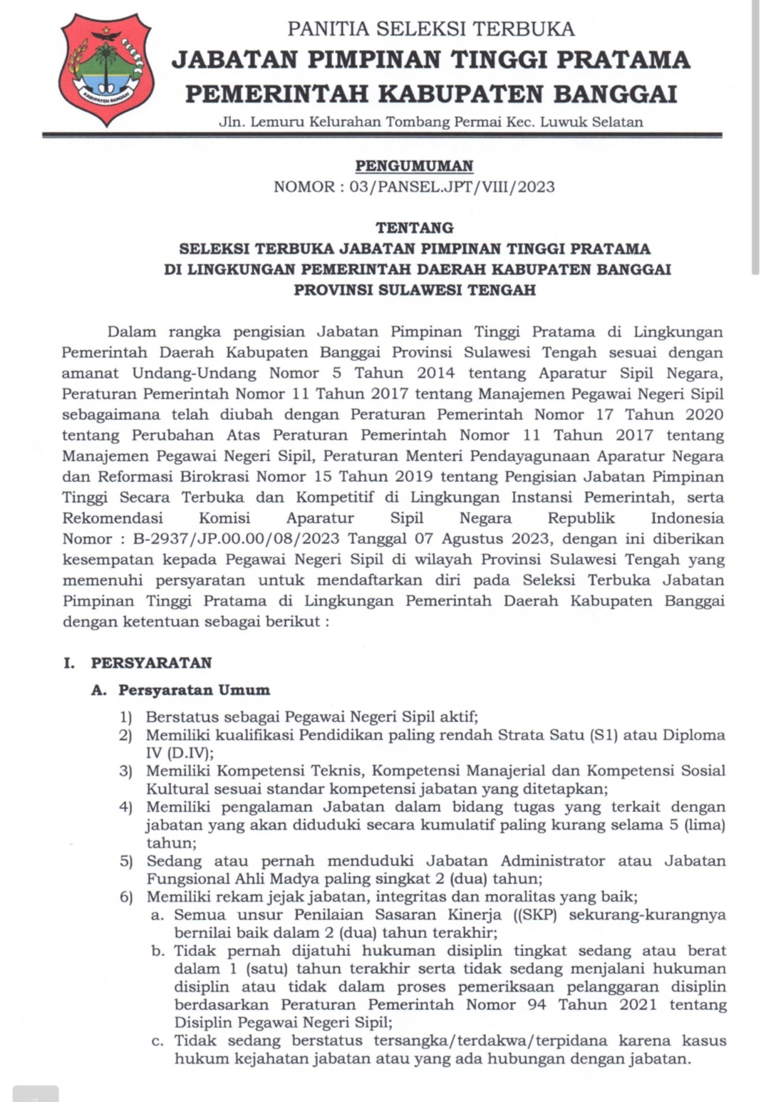 OBORMOTINDOK.CO.ID. BANGGAI- Pemda Banggai menggelar seleksi terbuka untuk pengisian kotak Jabatan Pimpinan Tinggi Pratama (PJPT).