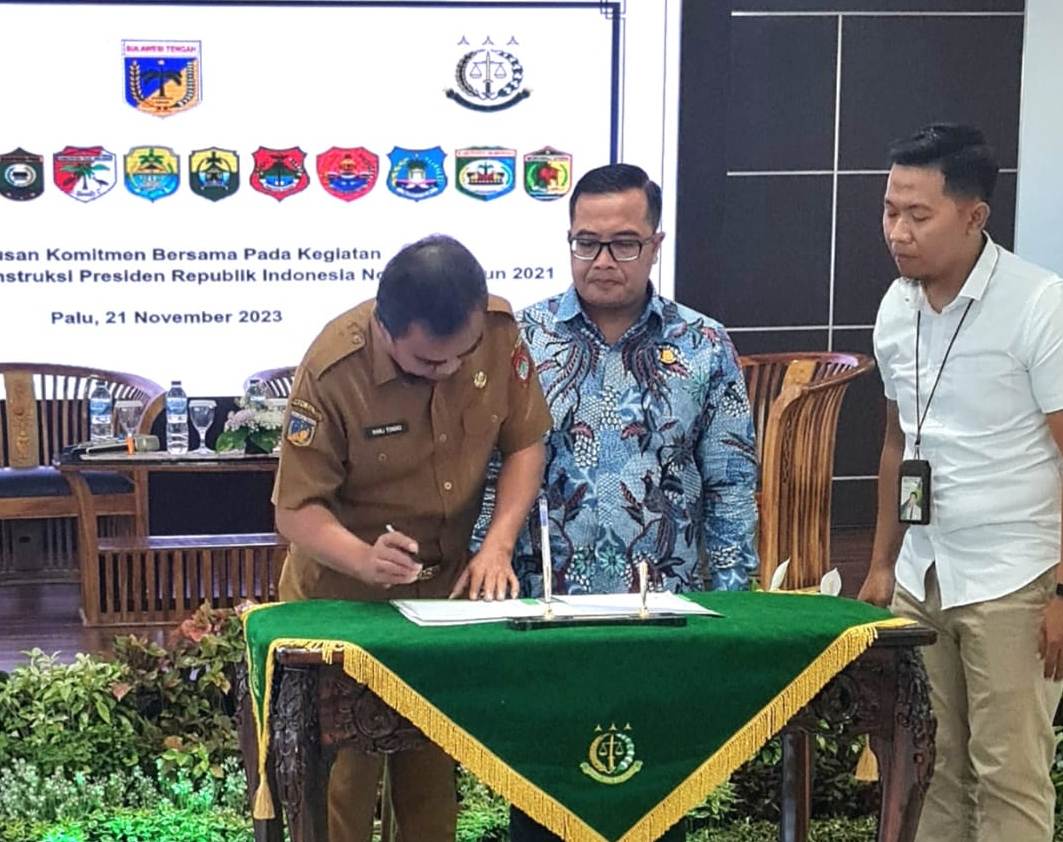 Bupati Banggai, Amirudin diwakili Kepala Bappeda Kabupaten Banggai, Ramli Tongko, S.Sos., ST., M.Si menghadiri agenda Rapat Monitoring dan Evaluasi Implementasi Instruksi Presiden Nomor 2 Tahun 2021 & Penandatanganan MoU antara BPJS Ketenagakerjaan dan Kejaksaan Negeri sejajaran wilayah Sulawesi Tengah, Selasa (21/11/2023).