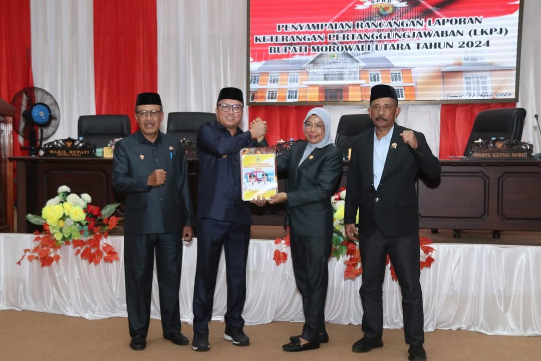OBORMOTINDOK.CO.ID. Morut– Pemerintah Kabupaten Morowali Utara (Morut), secara resmi menyampaikan Rancangan Laporan Keterangan Pertanggungjawaban (LKPJ) Bupati Tahun Anggaran 2024 dalam Rapat Paripurna DPRD Kabupaten Morowali Utara yang digelar di ruang rapat utama kantor DPRD, pada Jumat (11/4/2025).