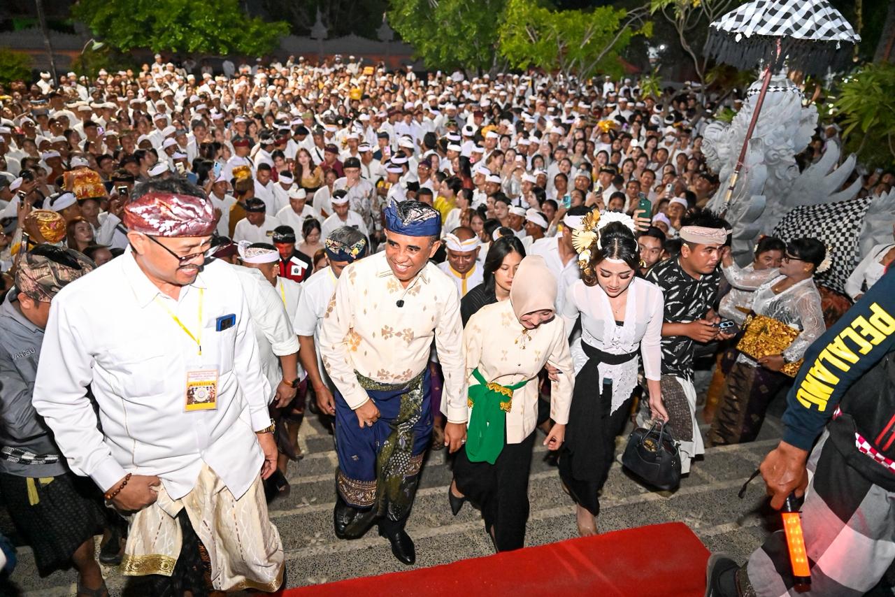 Suasana penuh kekhidmatan terasa sejak awal prosesi, di mana Gubernur mengenakan saput (sarung) dan udeng/siga, sementara Ketua TP-PKK tampil anggun dengan selendang adat, sebagai bentuk penghormatan terhadap tradisi dan budaya umat Hindu.