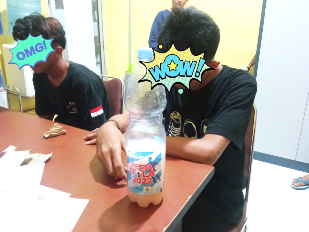 Bersama keduanya, Aparat Satpol PP berhasil menyita dan mengamankan barang bukti miras jenis ballo, berikut satu buah gelas kaca yang digunakan untuk menenggak minuman keras.