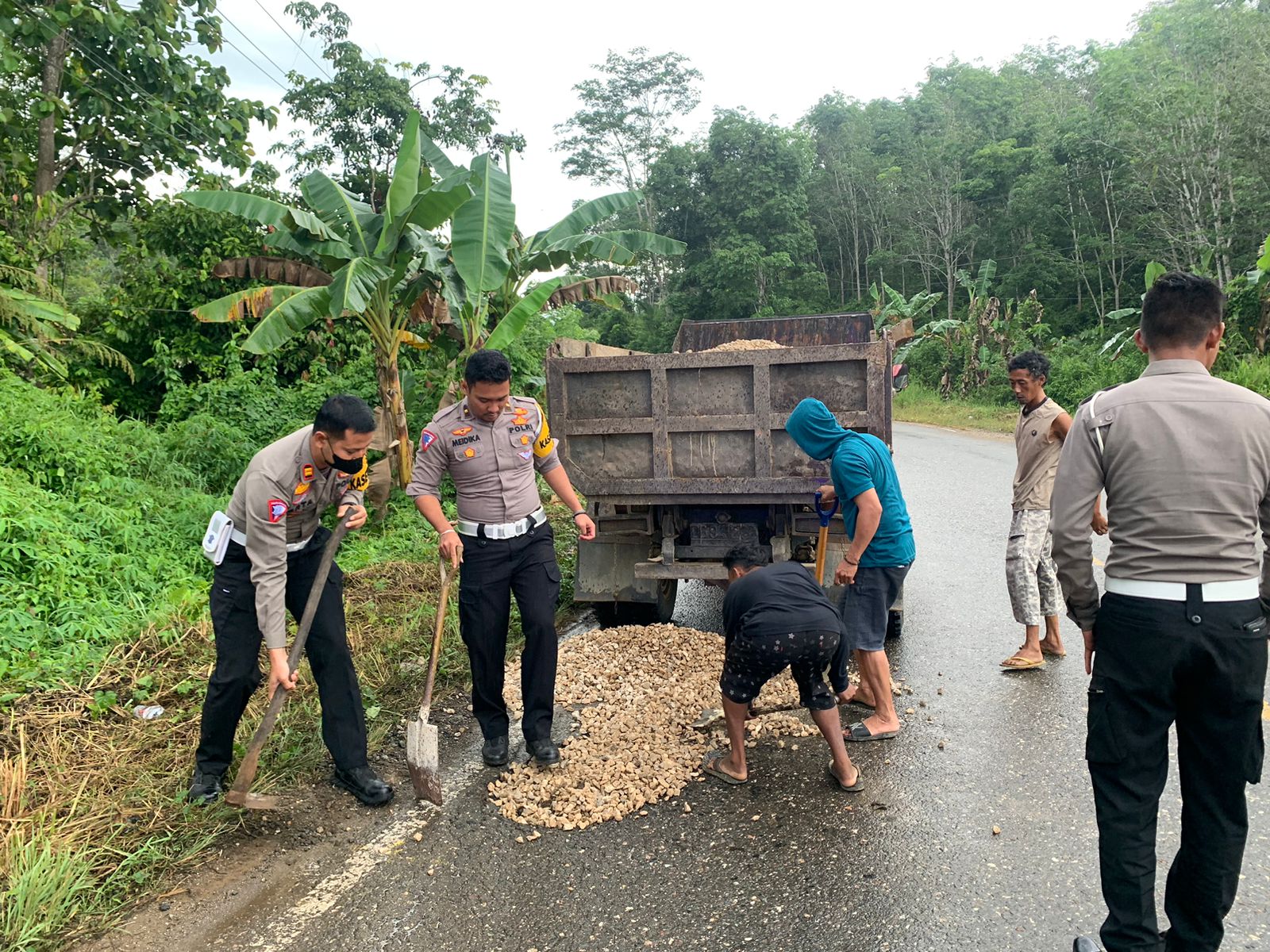 Dipimpin langsung oleh Kasatlantas Polres Morowali Utara, personel Satlantas dan beberapa warga melakukan penimbunan jalan yang berlubang di beberapa titik, yaitu di Jalan Trans Sulawesi Desa Korowou, Desa Lemboroma, Desa Korompeli, Desa Kumpi, Desa Tinompo, dan Desa Beteleme.