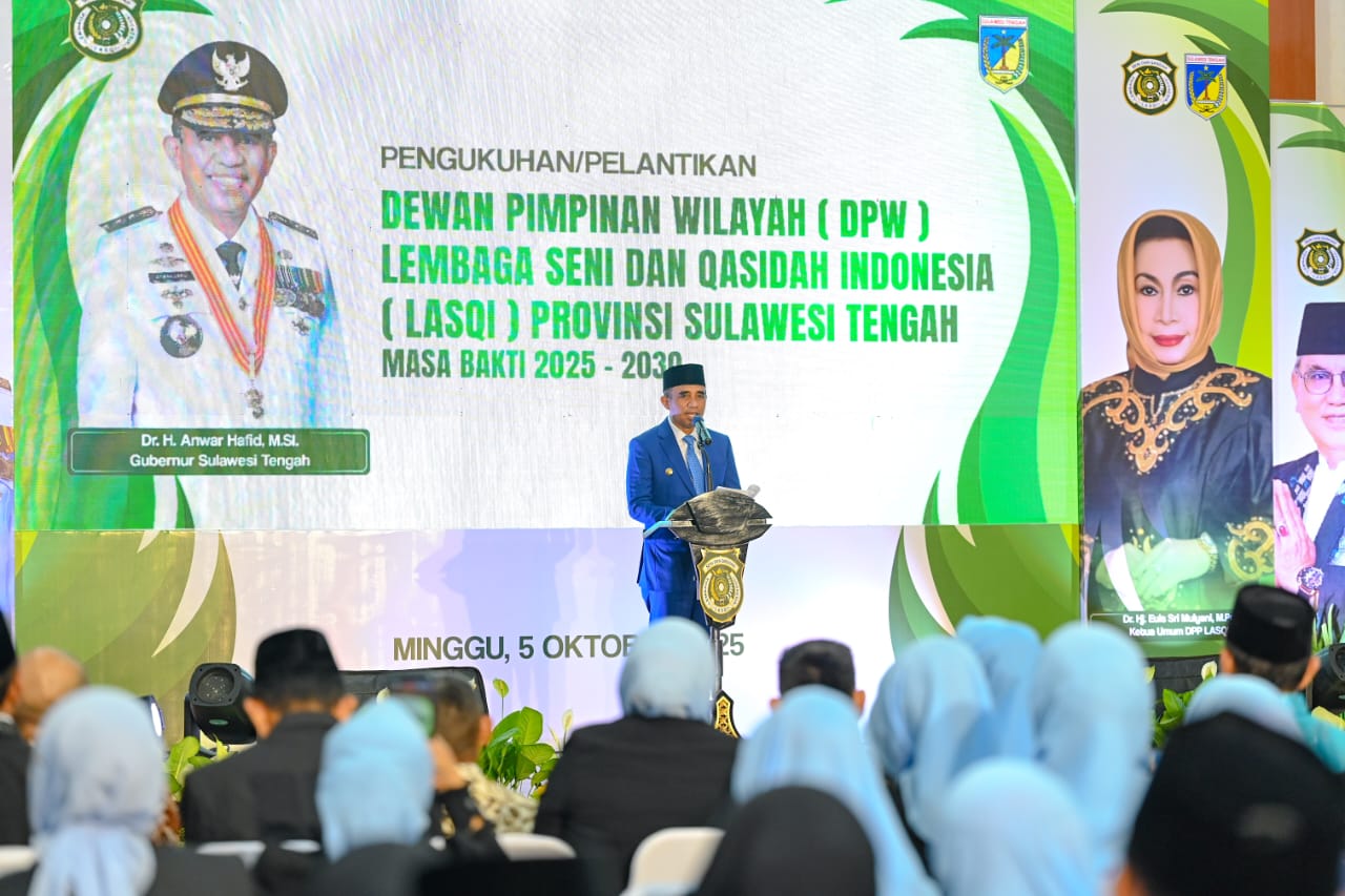 OBORMOTINDOK.CO.ID. Palu– Gubernur Sulawesi Tengah, Dr. H. Anwar Hafid, M.Si., memberikan apresiasi sekaligus ucapan selamat kepada pengurus Dewan Pimpinan Wilayah (DPW) Lembaga Seni dan Qasidah Indonesia (LASQI) Provinsi Sulawesi Tengah periode 2025–2030 yang resmi dikukuhkan di Gedung Pogombo, Minggu (5/10/2025).