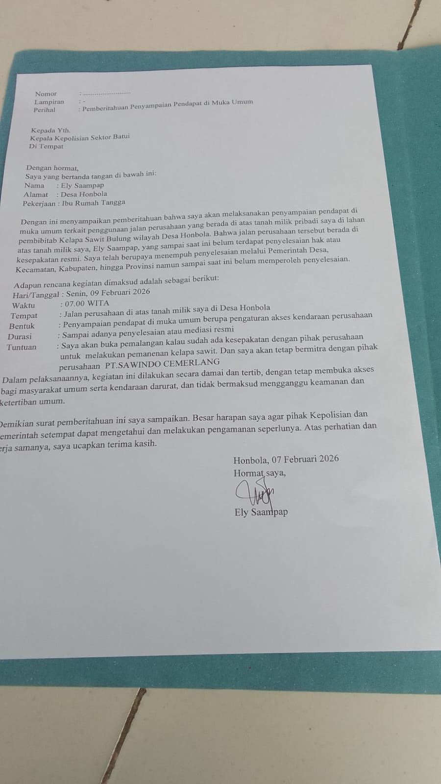 OBORMOTINDOK.CO.ID. Banggai– Konflik agraria kembali mencuat di Desa Honbola, Kecamatan Batui, Kabupaten Banggai. Kali ini, warga setempat berencana melakukan aksi demonstrasi dengan menutup akses jalan milik perusahaan kelapa sawit PT Sawindo Cemerlang. Aksi tersebut dijadwalkan berlangsung pada Senin, 9 Februari 2026, mulai pukul 07.00 WITA hingga selesai.