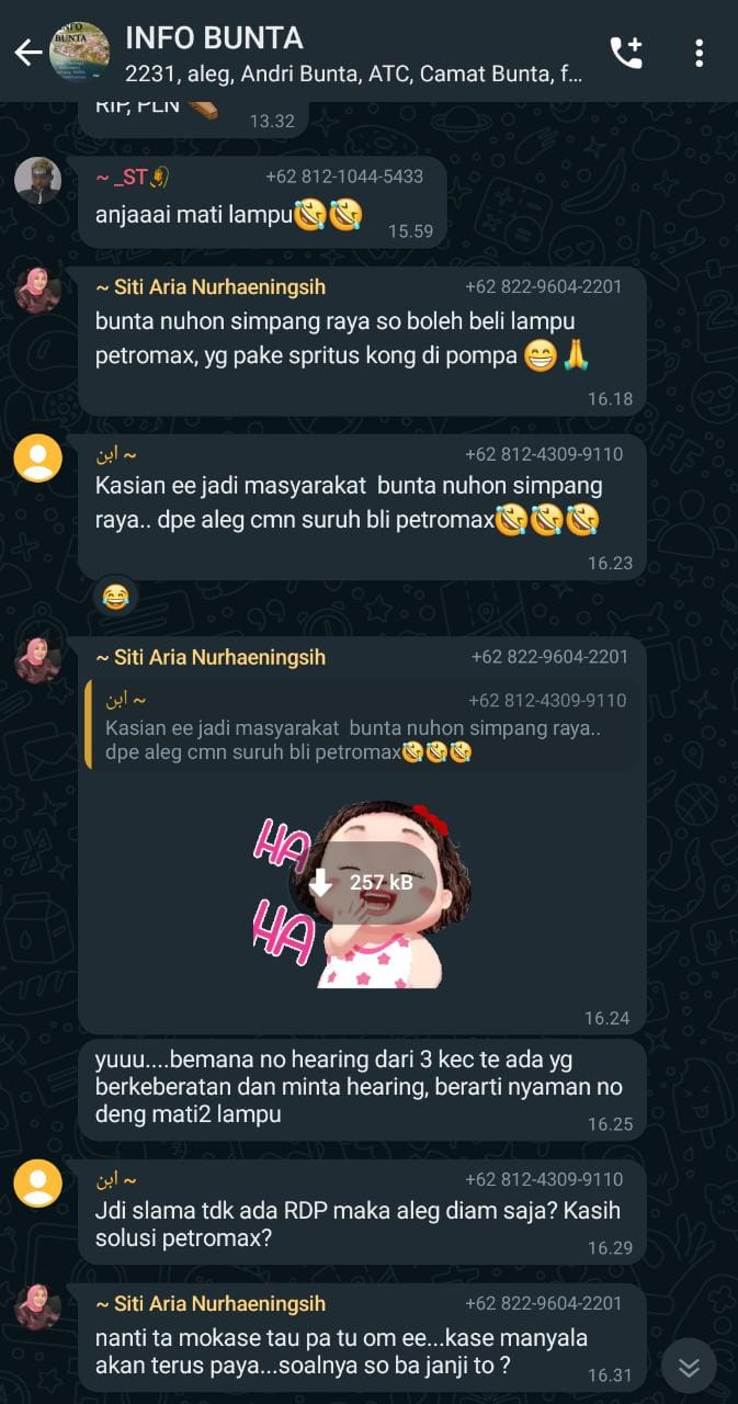 “Yuuu…bagaimana mo hearing 3 kecamatan, tidak ada yang keberatan dan minta hearing, berarti sudah nyaman dengan mati-mati lampu,” tulisnya dalam grup tersebut.