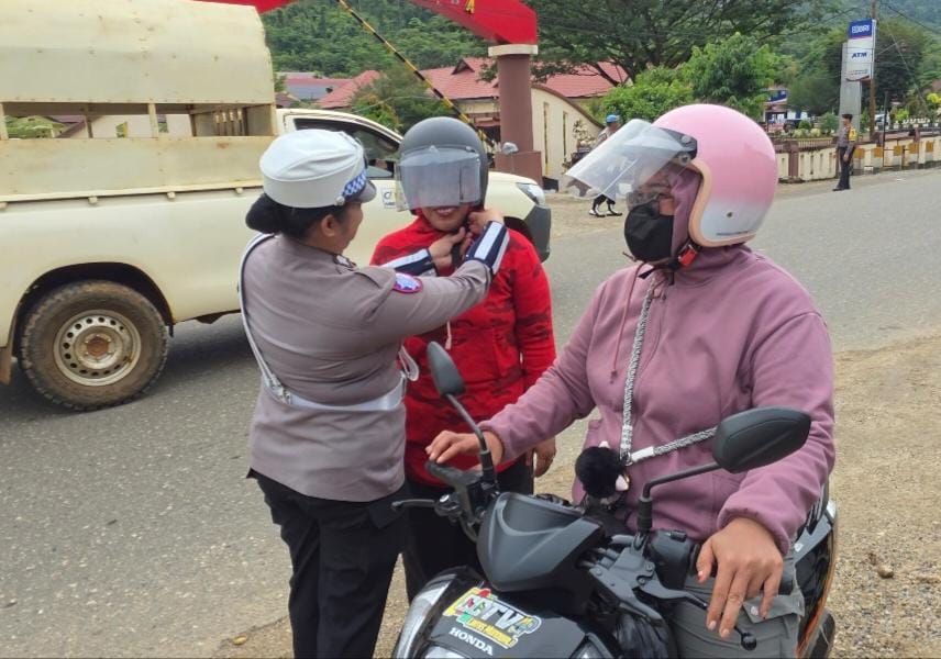 Ia menambahkan, selain memberikan teguran maupun penindakan kepada pelanggar, pihaknya juga membagikan helm dan jaket secara gratis kepada pengguna jalan yang melintas.