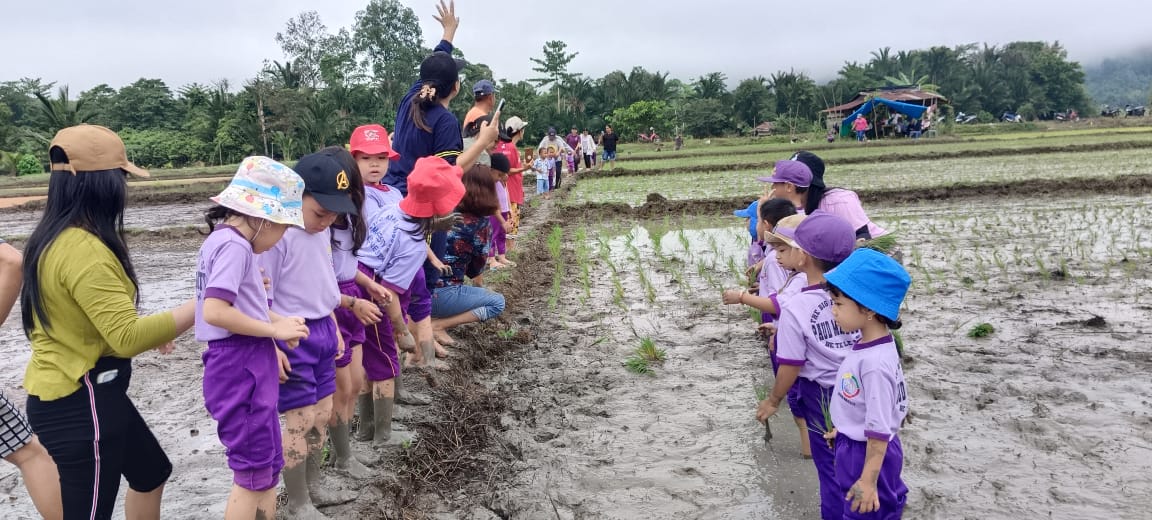 OBORMOTINDOK.CO.ID. Morut– Sekelompok anak-anak dari Taman Kanak-Kanak (TK) PAUD Majesty Beteleme, Kecamatan Lembo, Kabupaten Morowali Utara, (Morut), mengikuti kegiatan edukatif mengenal penanaman padi di sawah.