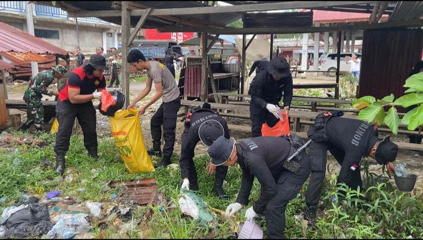Kegiatan ini melibatkan sinergi TNI, Polri, pemerintah desa, serta elemen masyarakat yang bahu-membahu membersihkan sisa-sisa sampah di area pasar tradisional tersebut. Sampah plastik yang berserakan dipungut satu per satu dan dimasukkan ke dalam kantong sampah demi menciptakan lingkungan yang lebih bersih dan sehat.
