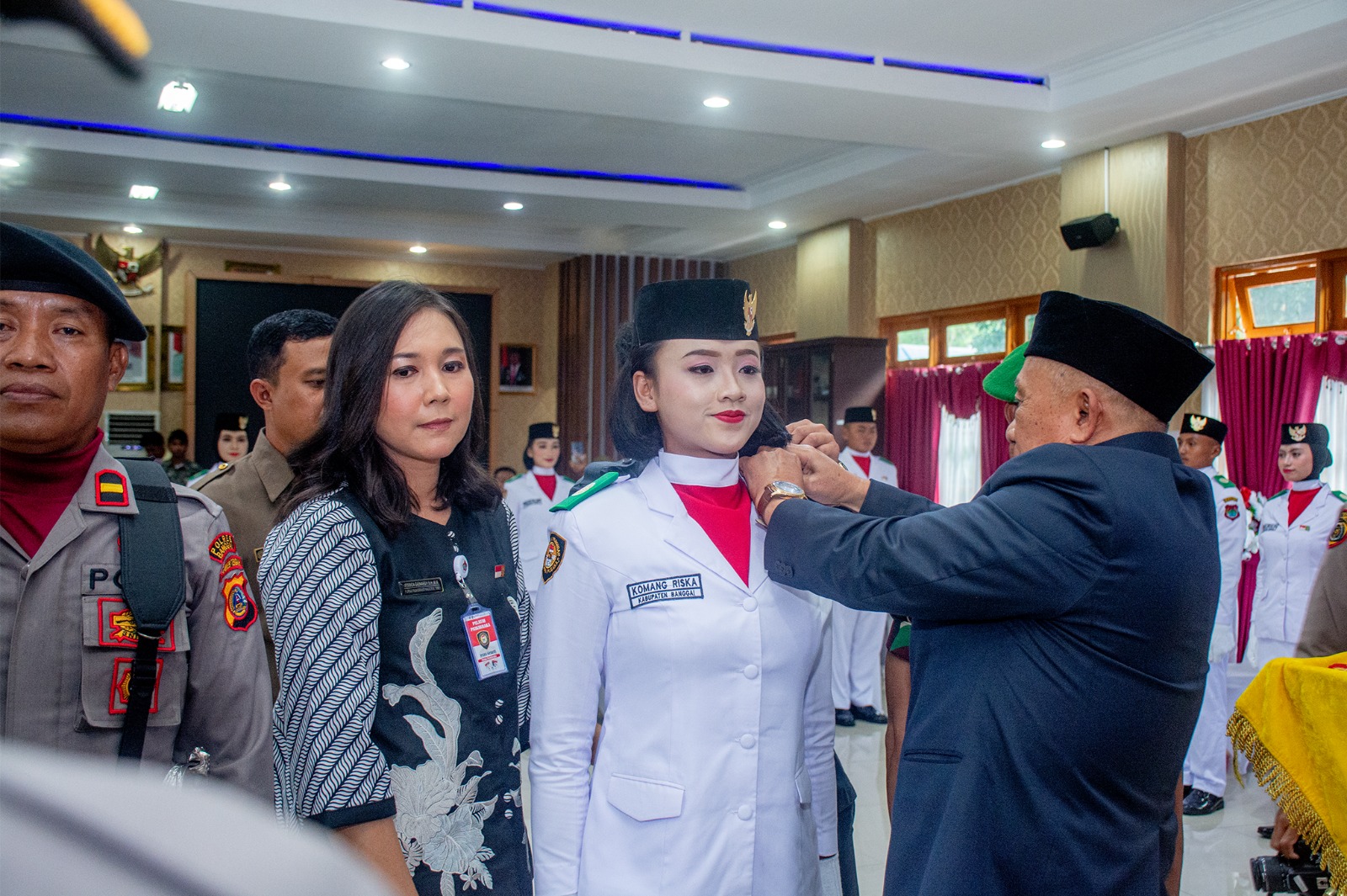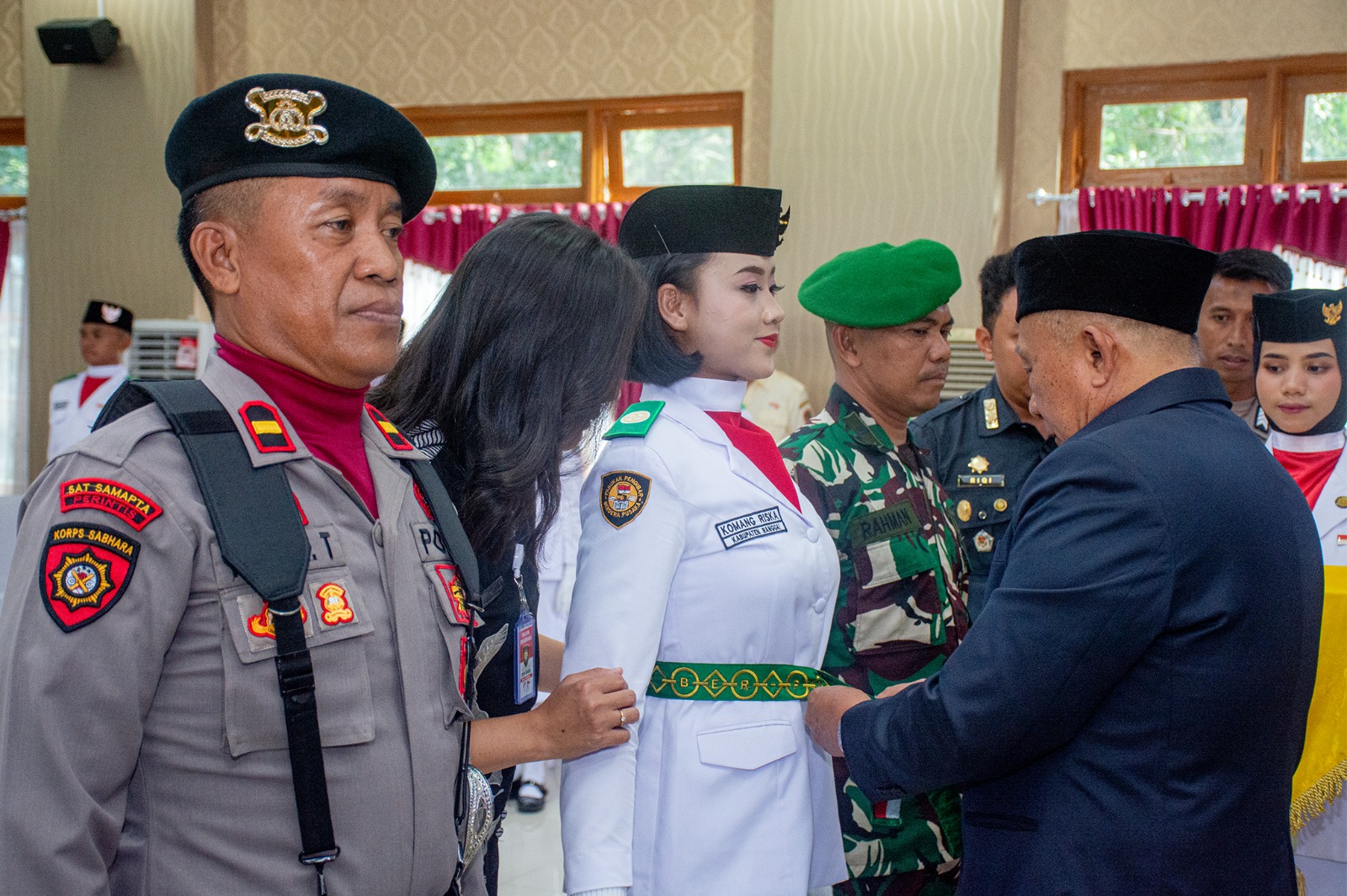 Pada kesempatan tersebut, Wabup Furqanuddin melakukan penyematan tanda pengukuhan dan kendit Paskibraka kepada Komandan Upacara Komang Riska.
