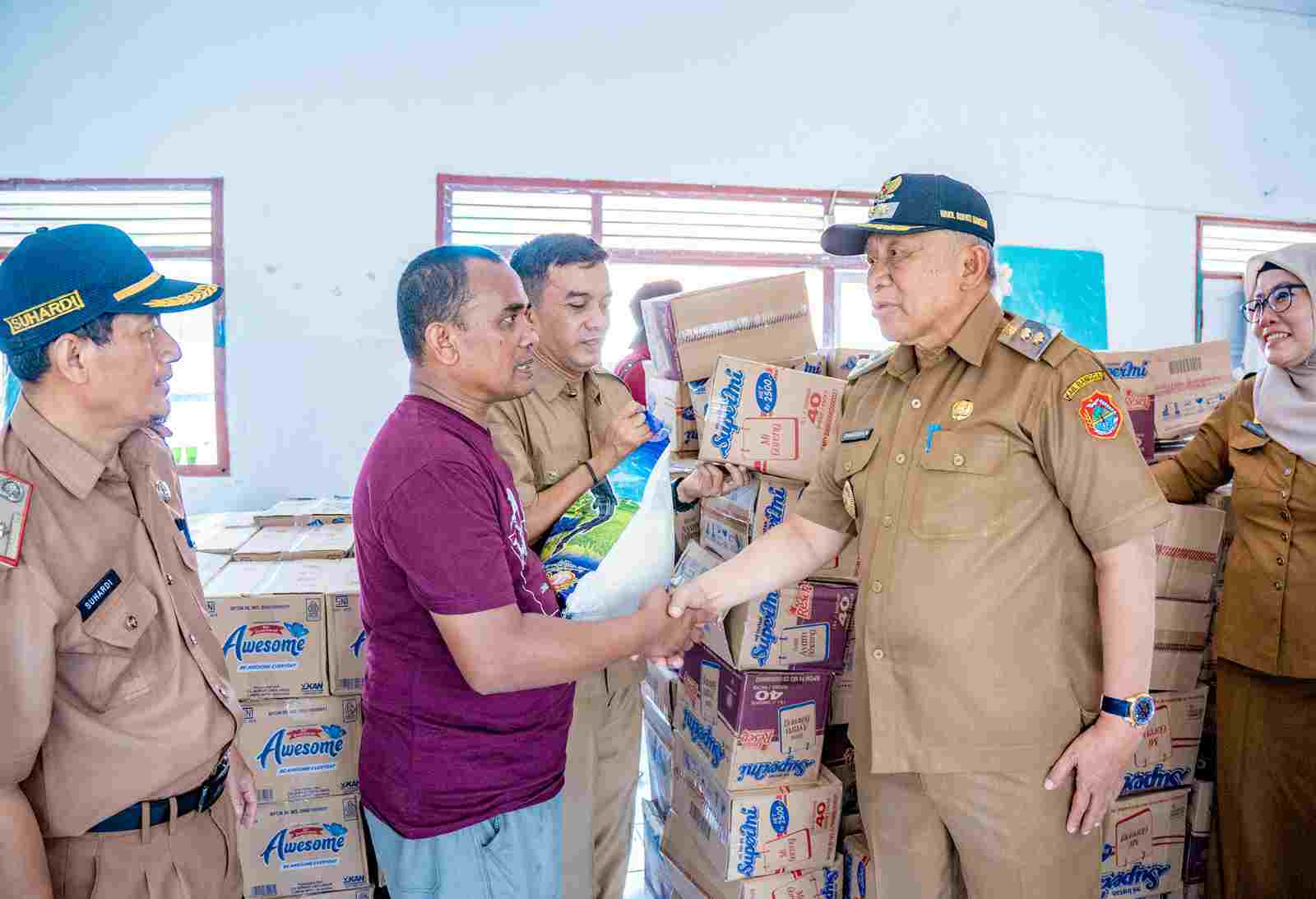 Pada kesempatan yang sama, Wabup secara simbolis menyerahkan bantuan berupa bahan makanan, termasuk mi instan dan beras, yang disalurkan oleh BPBD Kabupaten Banggai.