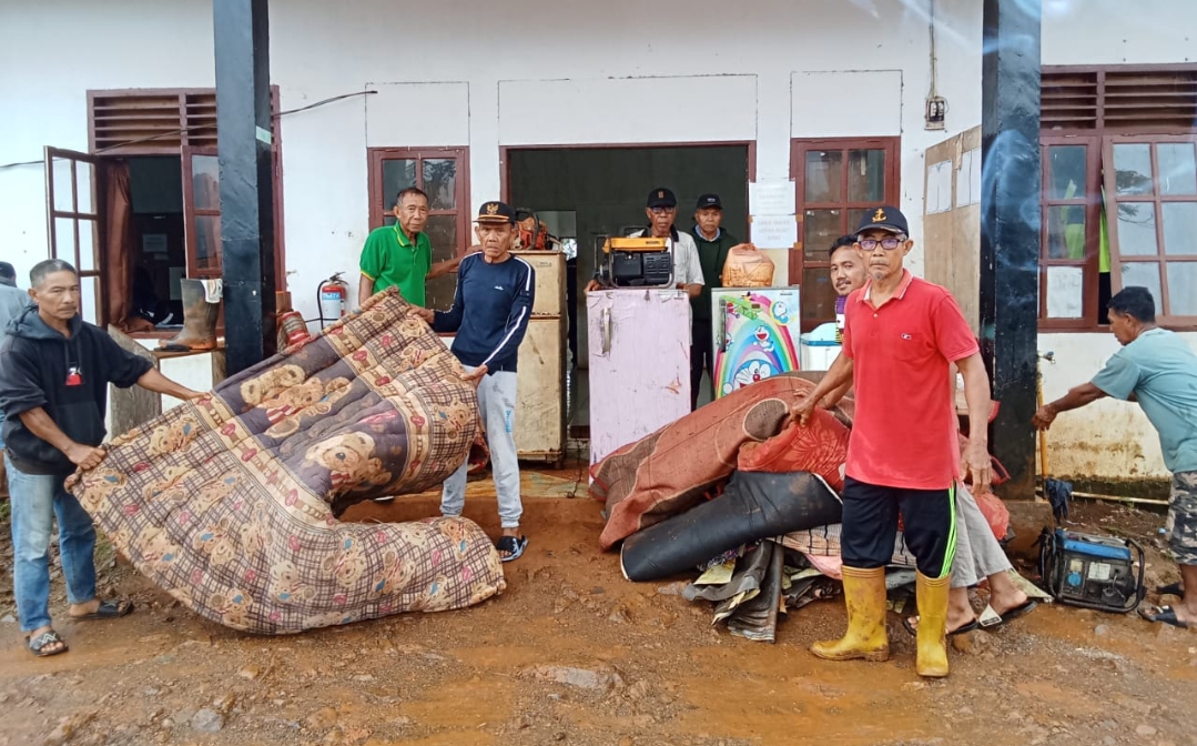 Warga membawa perabotan rumah tangga yang hancur akibat banjir, seperti tempat tidur, meja, kursi, kulkas, peralatan dapur, dan alat elektronik lainnya.